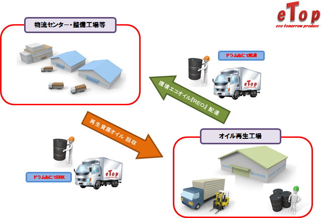物流センター内修理工場、外部委託等の修理工場などより、オイル交換時に発生いたしました使用済みエンジンオイルを弊社指定のドラム缶に保存をして頂きます。それをトラックにてお引き取りに伺います。そのオイルを自社工場にて再生を行い、ご注文を頂きましたらご納品に伺います。